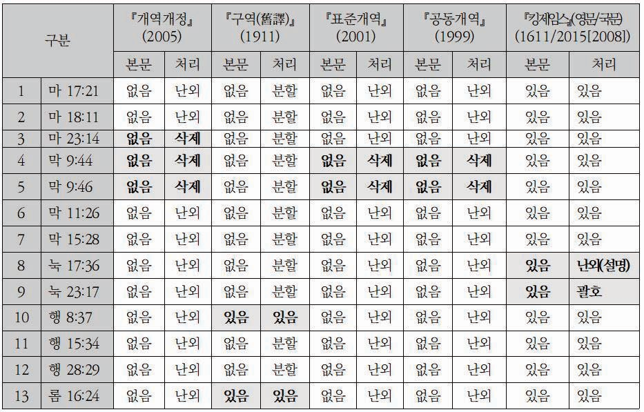 2.2 “없음” 구절들에 대한 국역 성경들의 상태와 처리 방식