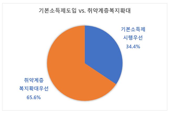 특히 기본소득제 도입과 취약계층 복지확대 중 무엇을 우선적으로 시행해야 한다고 생각하는지를 묻는 질문에는 65.6%가 취약계층을 위한 복지정책 확대를 선택했다.