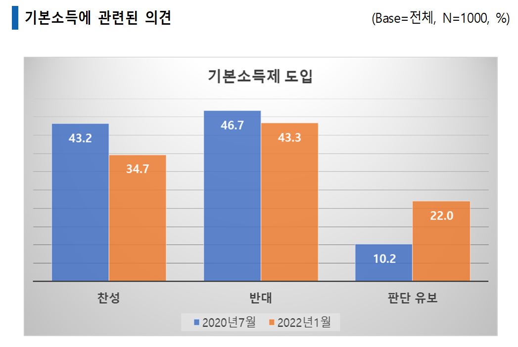 사회구성원 모두에게 균등하게 일정 소득을 지급하는 기본소득제도 도입에 대해 43.3%가 반대, 34.7%가 찬성 의견을 보여 반대가 8.6%p 더 높게 나타났다.