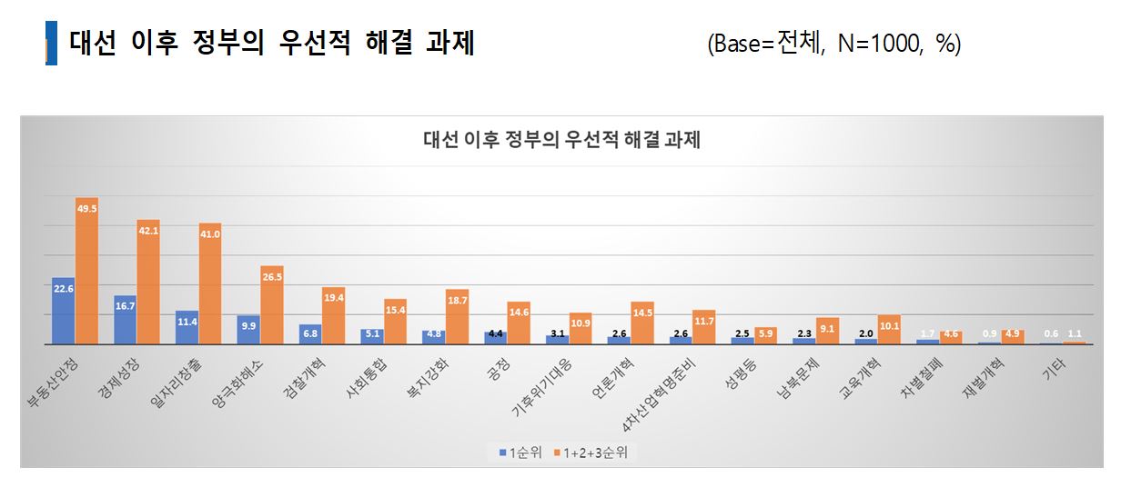 설문조사 결과에 따르면 오는 3월 대선 이후 정부가 해결해야 할 우선적인 과제로 부동산 안정(1순위:22.6%, 1+2+3순위:49.5%)을 가장 많이 꼽았고, 그 뒤를 경제성장과 일자리 창출, 양극화 해소가 있었다. 경제 분야 문제를 해결해야 한다는 인식이 압도적으로 크다는 사실을 확인할 수 있다.