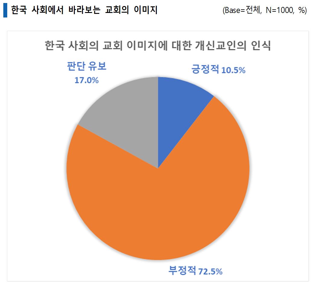 한국 사회에서 바라보는 교회의 이미지에 대해 응답자의 다수가 ‘부정적’이라고 응답했다(72.5%). 교회의 이미지가 ‘긍정적’이라는 응답률은 10.5%로 ‘부정적’이라는 응답률의 1/7 수준으로 낮게 나타났다.
