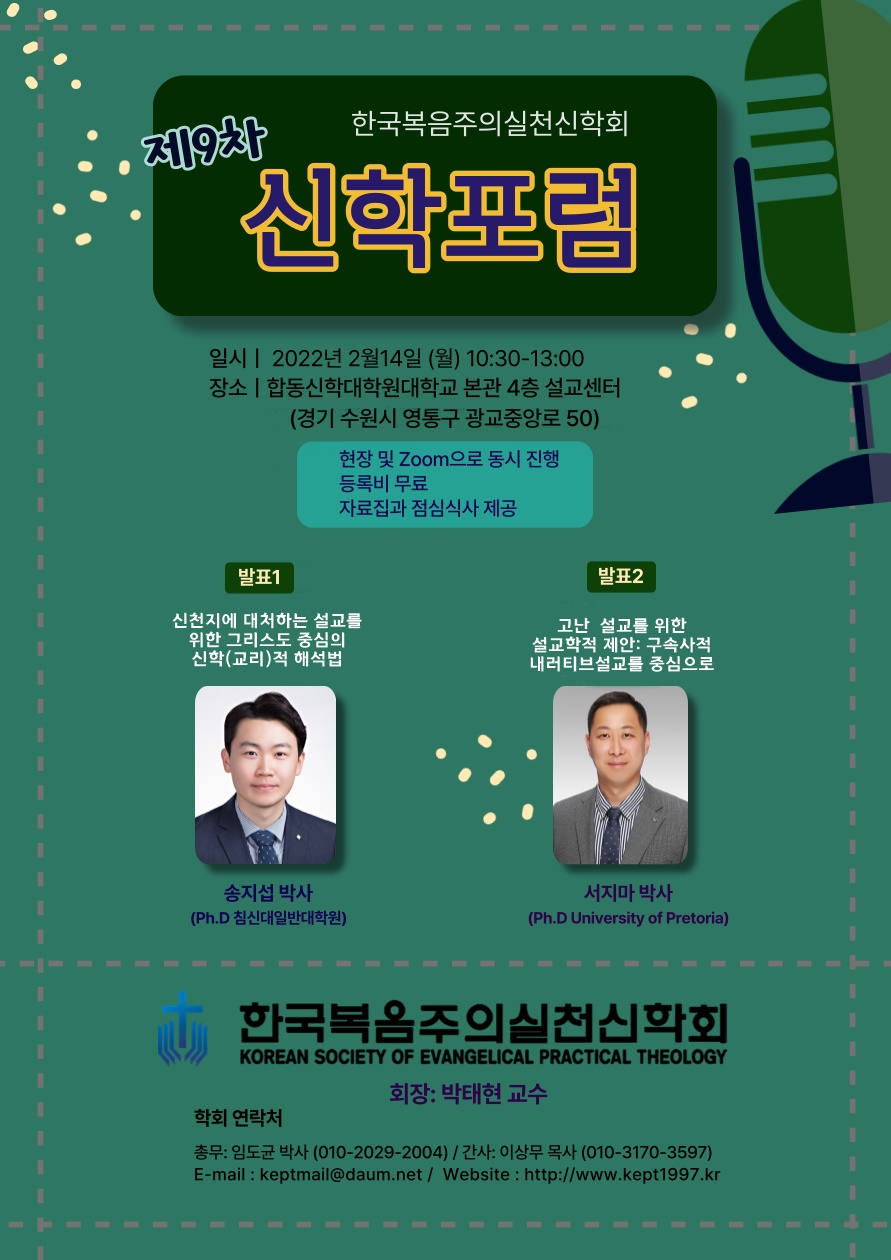 한국복음주의실천신학회(회장:박태현 박사, 총신대 교수)가 오는 2월 14일(월) 오전 10시 30분 합동신학대학원대학교 본관 4층 설교센터에서 '제9차 신학포럼'을 개최한다.