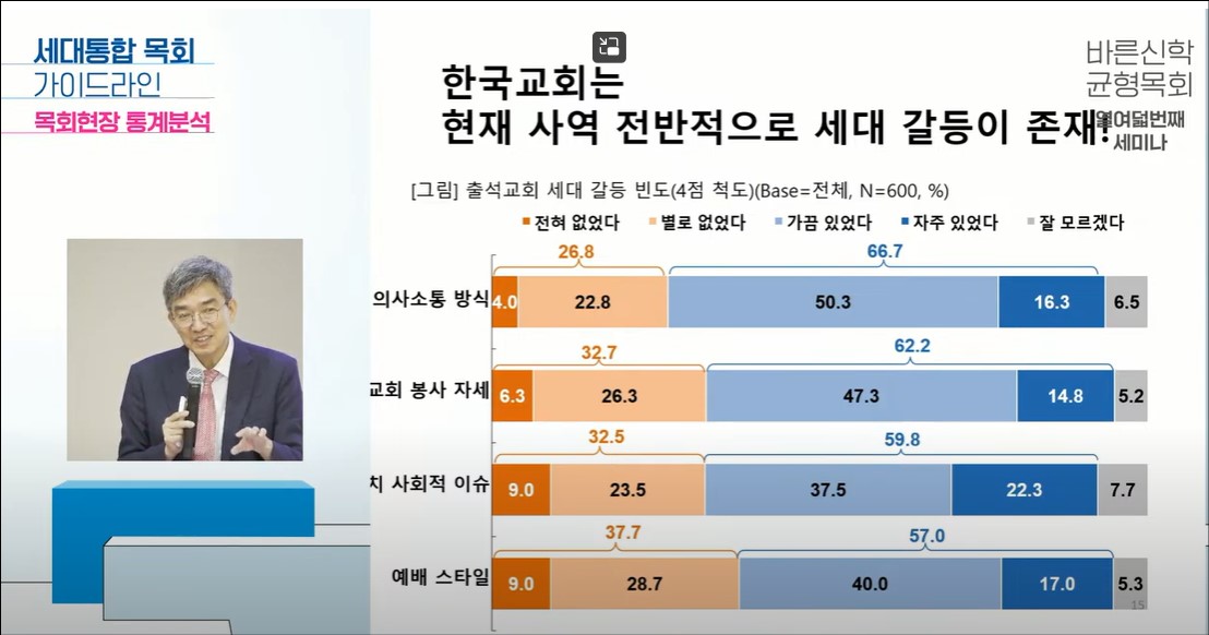 <세대통합 목회 가이드라인>을 제시하기 위해 마련된 이번 세미나에서 세대통합 목회를 위한 설문조사 결과가 발표됐다. 설문조사 결과는 지용근 대표(목회데이터연구소)가 발표했다. (영상보기)