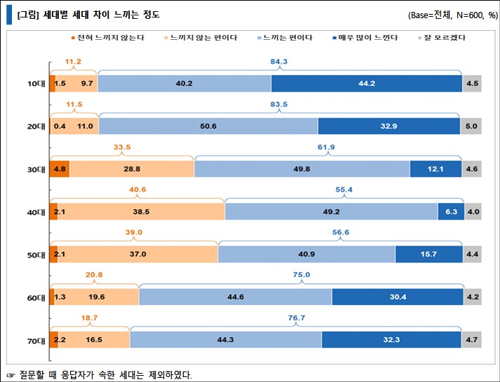 연령대와 세대 차이를 느끼고 있는지 질문한 결과, 10대와 세대 차이를 느낀다(매우 많이+느끼는 편이다)는 응답이 84.3%, 20대 83.5%로 다른 세대보다 가장 높게 나타났다. 그 다음으로는 70대 76.7%, 60대 75.0% 등으로 고령층과 세대 차이를 느낀다는 비율도 상당히 높았다.