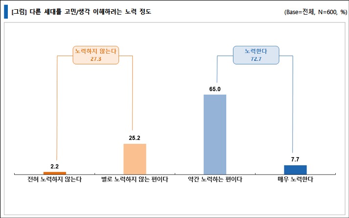 다른 세대의 고민과 생각을 이해하려고 노력하는지에 대해 질문한 결과, '노력한다'는 응답이 72.7%, '노력하지 않는다'는 응답이 27.3%로 '노력한다'는 응답이 3배 가까이 높게 나타났다. '노력한다'는 응답이 세대별로 차이가 있는데, 40대 이하는 60%대, 50대와 60대는 80%대로 큰 차이를 보였다. 즉 50~60세대는 스스로 자신들이 다른 세대(주로 아랫 세대)를 이해하려고 노력한다고 자부하고 있는 것으로 나타났다.