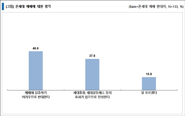 반면, 온 세대 예배에 반대하는 응답자에게 어린이 주일과 같은 특별한 절기에만 온 세대 예배를 드리는 것에 질문했을 때 46.6%는 온 세대 예배가 '예배에 집중하기 어려우므로 반대한다'고 응답했으며, 37.6%만이 '세대 통합, 세대 갈등 해소 등의 효과가 있으므로 찬성한다'고 응답해서 반대 의견 여전히 높았다.