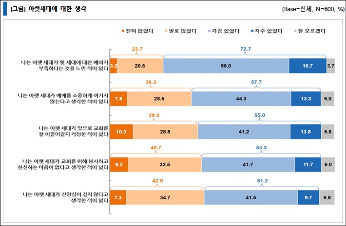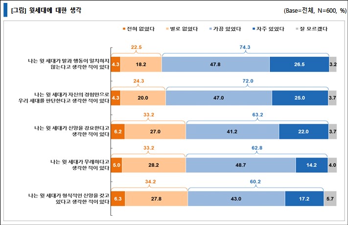 ‘윗세대가 말과 행동이 일치하지 않는다고 생각한 적이 있다’는 응답이 74.3%로 가장 높았으며, ‘윗 세대 가 형식적인 신앙을 갖고 있다고 생각한 적이 있다’는 응답도 60.2%였다.