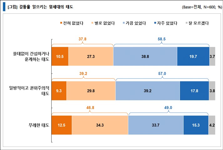 '일방적이고 권위적인 태도'와 '쓸데없이 간섭하거나 훈계하는 태도'는 세대 간에 뚜렷한 차이를 보이지 않았는데, 60대의 50%가 '일방적이고 권위적인 태도'를 응답한 것은 60대도 문제의 본질을 정확하게 알고 있고 있는 것으로 나타났다.