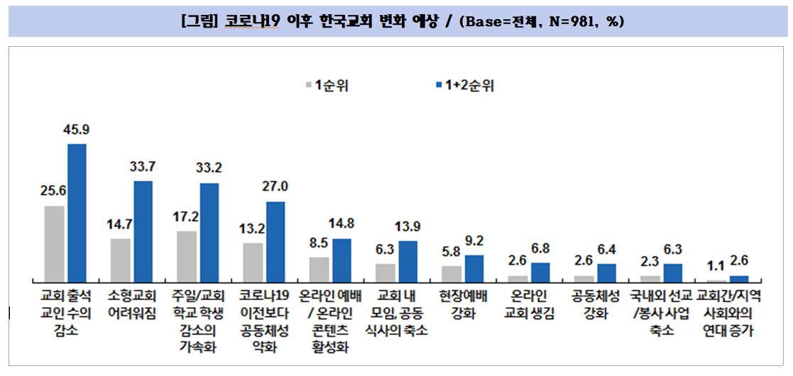 코로나19 이후 예상되는 한국 교회의 변화에 대해 물은 결과, 가장 크게 변화될 것으로 ‘교회 출석 교인 수의 감소’를 꼽은 비율이 가장 높았다(1+2순위 기준). 이어 ‘소형교회 어려워짐’, ‘교회학교 학생 감소의 가속화’, ‘공동체성 약화’ 등의 순으로 응답되었다.