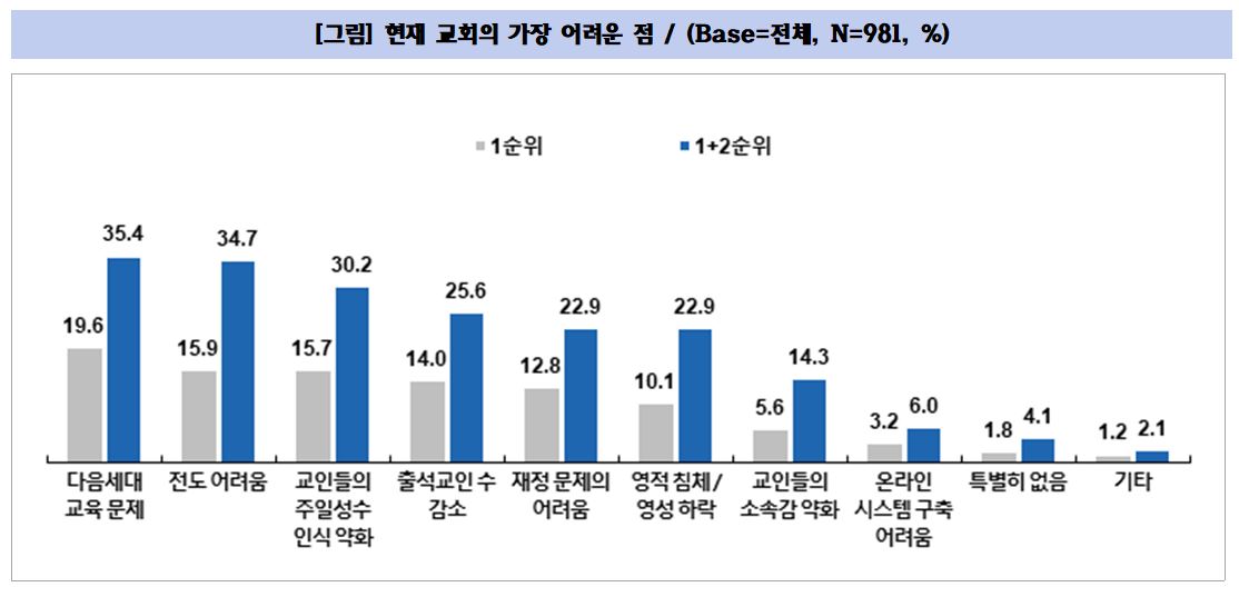 현재 교회의 가장 어려운 점을 물은 결과(1+2순위 기준), 목회자들은 ‘다음 세대 교육 문제’와 ‘전도의 어려움’이라고 답했다.