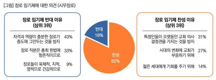그 이유에 대해 조사한 결과, ‘특정인들이 오랫동안 교회 의사 결정권을 가지는 것을 방지하기 위함’(31%) 의견을, 반대로 ‘장로 임기제 반대 이유’는 ‘자격과 역량이 충분한 장로가 중도에 그만두는 것을 방지하기 위함’(43%)을 각각 1위로 꼽았다.