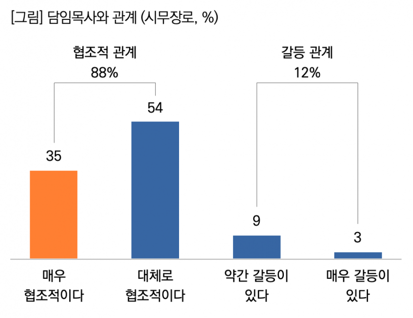 담임목사와의 관계와 관련해서 조사한 결과 88%가 담임목사와 협조적인 관계를 맺고 있는 것으로 조사됐다.