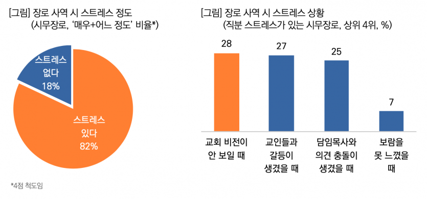 한국교회 장로 10명 중 8명은 교회 비전과 교인/담임목사와의 갈등 등으로 사역 스트레스를 받고 있는 것으로 조사됐다. 또한 장로 관련 제도 중 '장로 임기제에 대해 찬성하는 비율은 82%로 나타났다.
