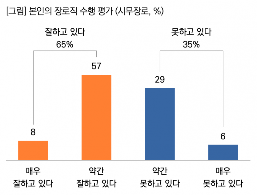 장로 인식에 대한 조사 결과 장로 3명 중 2명은 본인의 장로직 수행을 '잘하고 있다'고 평가하고 있는 것으로 조사됐다.