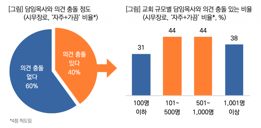 교회 규모별로는 대형 교회와 소형 교회보다는 101~1,000명 규모의 중형교회에서 장로와 담임목사 간의 의견 충돌 비율이 높은 특징을 보였다.