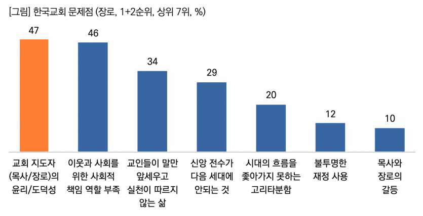 장로들을 대상으로 한국 교회의 가장 큰 문제점은 무엇인가라고 질문한 결과, 47%가 '교회 지도자의 윤리/도덕성'(47%)이라고 응답했다.