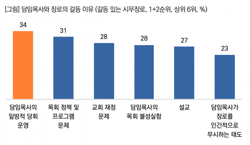 이와 관련 장로들이 담임목사와 어떤 문제로 갈등을 경험하고 있는지 조사한 결과, 장로 3명 중 1명 정도(34%)는 ‘담임목사의 일방적 당회 운영’ 때문이라고 응답했다. 다음으로 ‘목회 정책 및 프로그램 문제’ 31%, ‘교회 재정 문제’ 28% 등의 순이었다. ‘담임목사의 목회 불성실함’(28%)과 ‘설교’(27%) 등 목회적 영역을 꼽은 비율도 4명 중 1명 이상으로 나타났다.