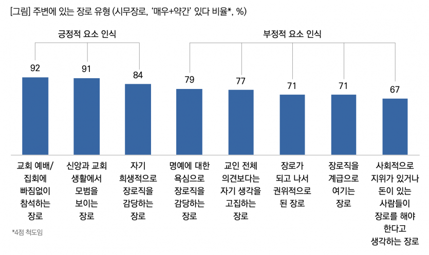 반면, ‘명예에 대한 욕심으로 장로직을 감당하고’(79%), ‘교인 전체 의견보다는 자기 생각을 고집하는 장로’(77%)가 있다는 등 부정적 인식에 대한 동의율 또한 높게 나타났다.