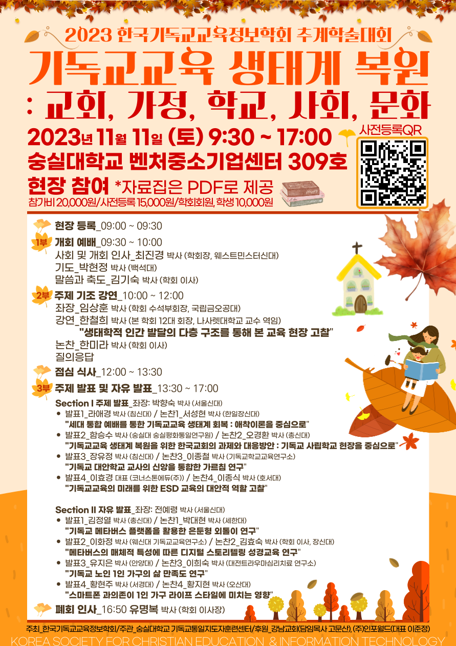 한국기독교교육정보학회(회장:최진경 박사, 웨신대 교수)가 오는 11월 11일(토) 오전 9시30분 숭실대 벤처중소기업센터 309호실에서 2023년 추계학술대회를 개최한다.